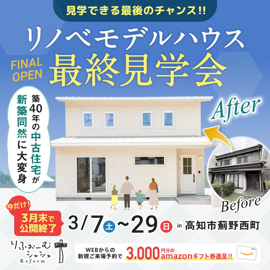 【3/7(土)~3/29(日)】薊野リノベモデルハウス 最終見学会こちらは、りふぉーむシュシュのイベントです。