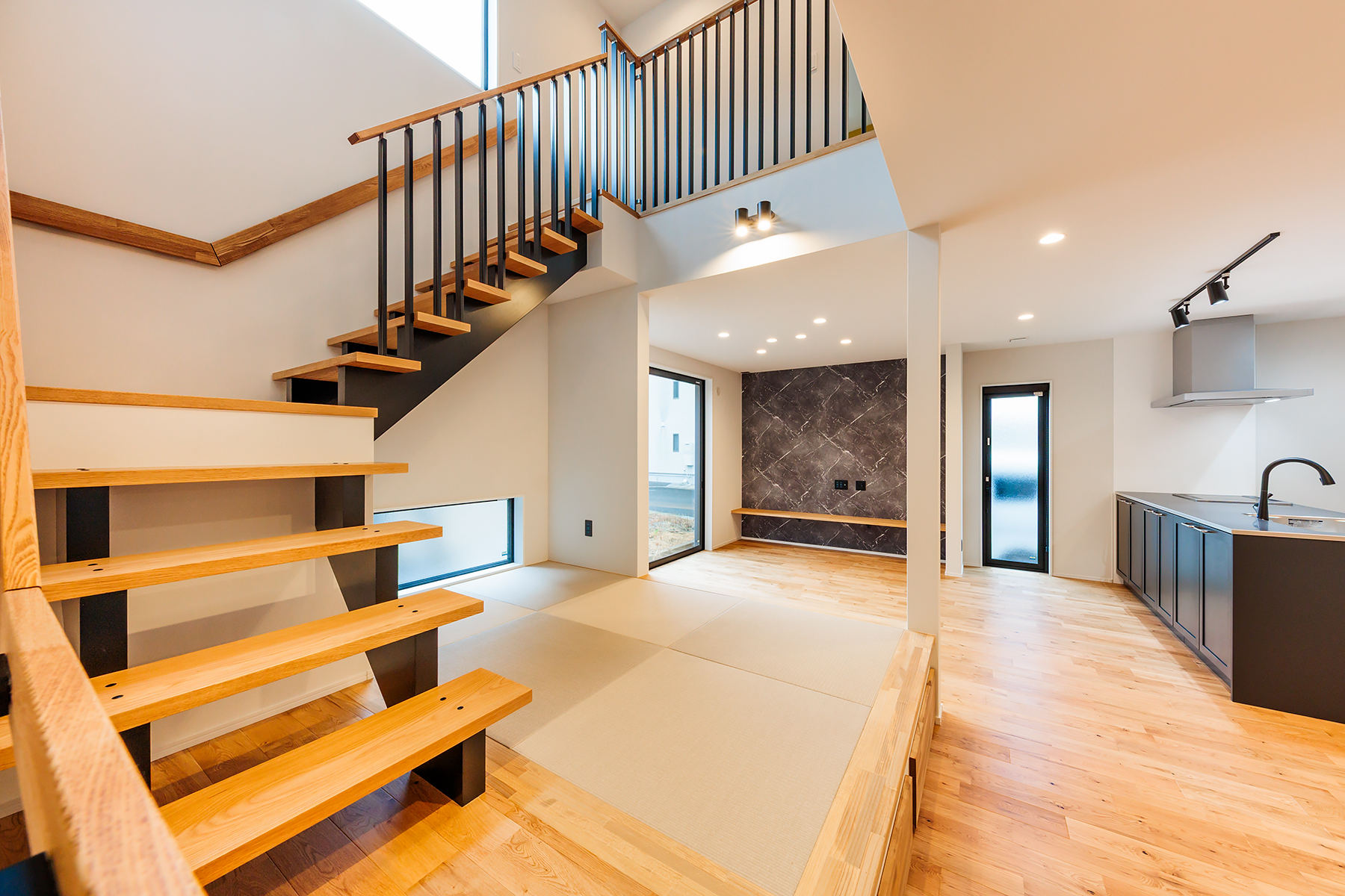 スケルトン階段と吹き抜けが空間に広がりを生み、
