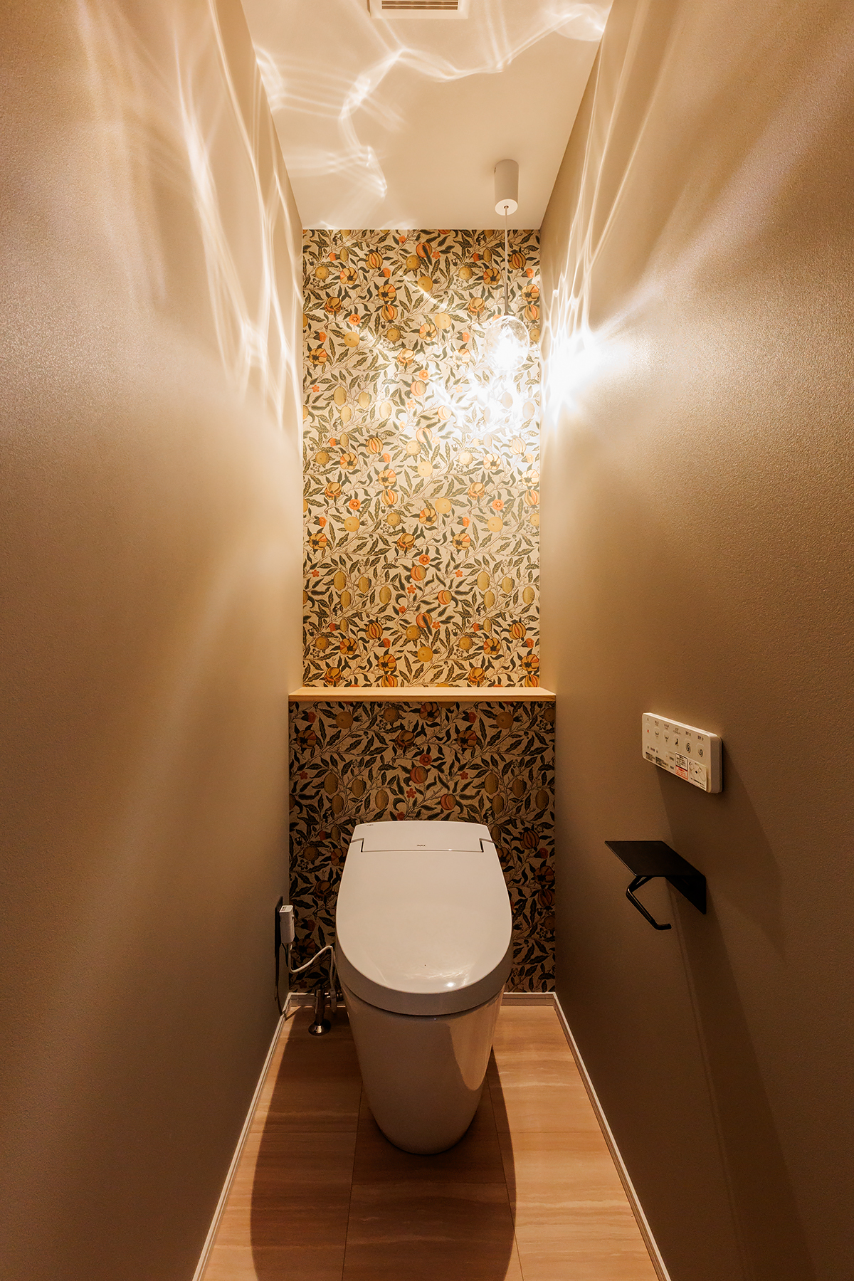 アクセントクロスと照明の光がやわらかく広がり、