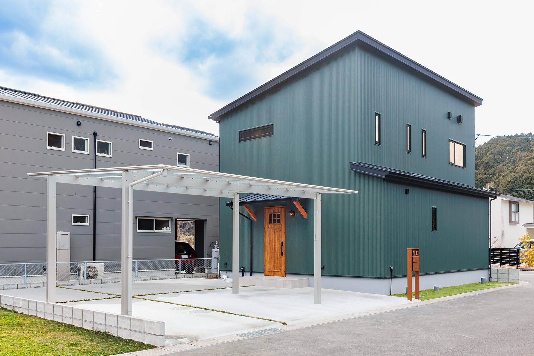 落ち着いた深みのある色合いに、木の玄関ドアがやさしいアクセント。